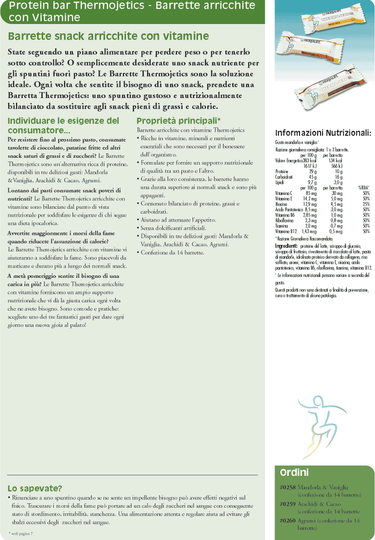 Sono disponibili in tre gusti: Mandorla e Vaniglia, Cioccolato e Arachidi ed Agrumi.Sono letteralmente squisite e sono degli snack salutari, con proteine di alto valore biologico, vitamine, pochissimi carboidrati e altrettanto pochi grassi.Ottime al posto delle merendine o dei dolci in generale, appagano completamente la voglia di masticare e di concedersi "qualcosa di buono".Ogni barretta apporta circa 10 gr. di proteine. Confezione da 14 barrette